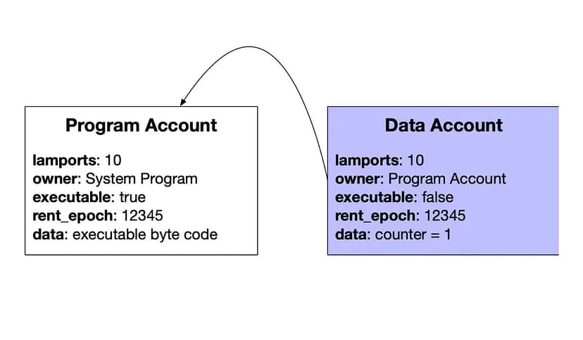 In the Solana blockchain, there is a separation between the program and the data/state of the program. Both are assigned separate accounts but are connected. Comparing this to Ethereum, a smart contract and the data of that smart contract are located in one location on the blockchain. If you were to make a program that counted the number of token transfers that a program made, you would need to create the program to make the transfers as well as another account to store the count of transfers